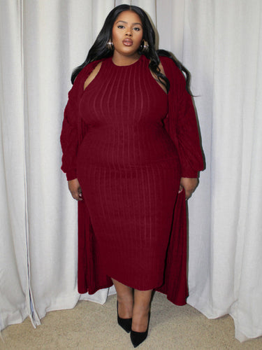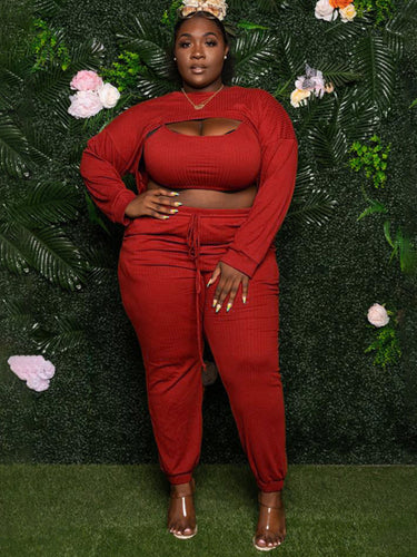 Plus Size Women's Fashion Sexy Chest Opening Hollow Solid Color Ribbed Three-Piece Sweatshirt Suit +