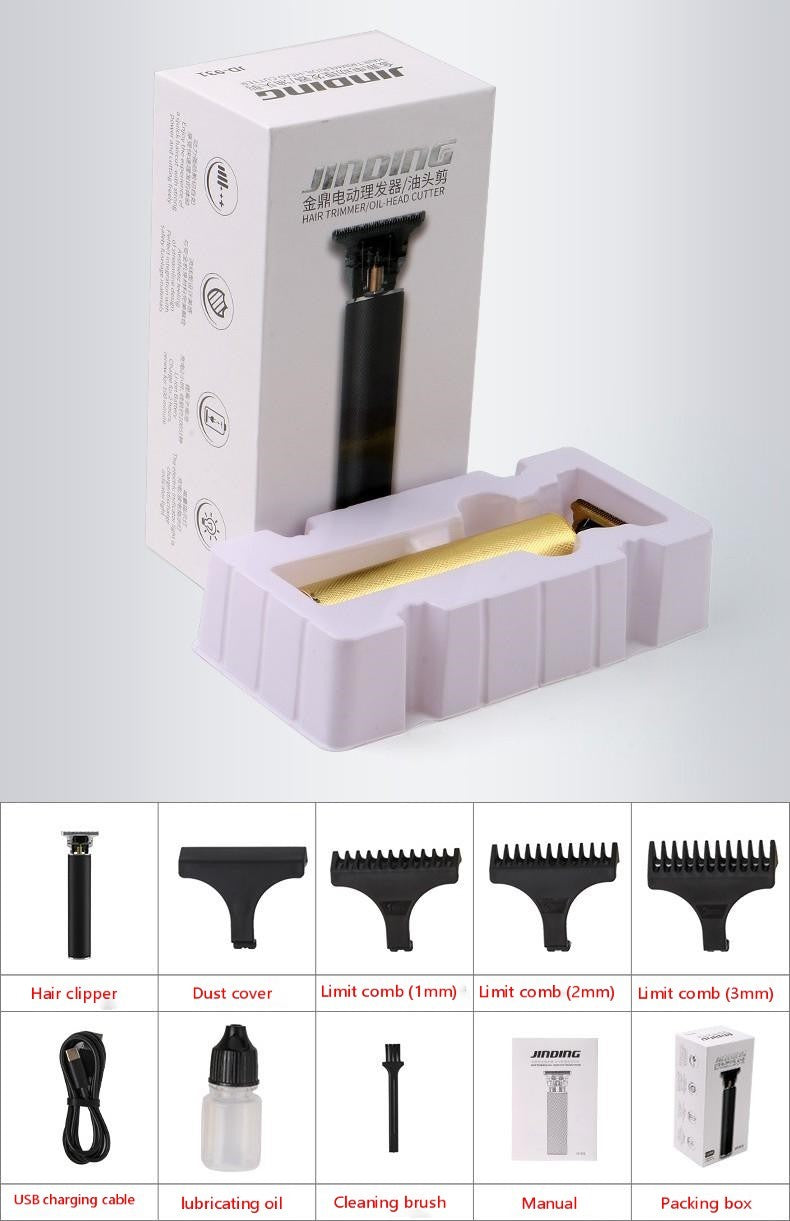 Gift box packaging, complete machine supporting: 1MM, 2MM, 3MM three limit combs, a cutter head protective cover, a USB charging cable, a cleaning brush, a bottle of lubricant, and a Chinese and English manual.