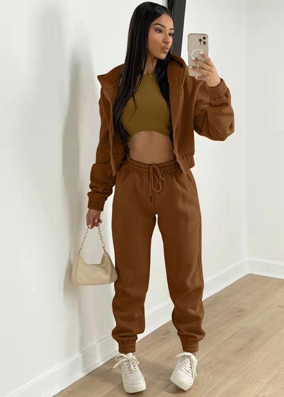Women's Knitted Casual Sports Fleece Hooded Three-piece Suit +